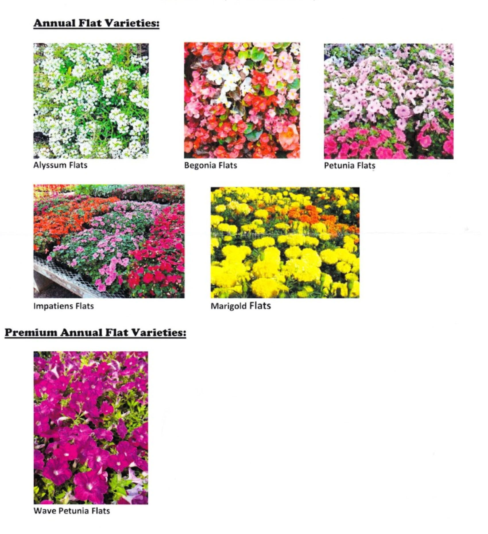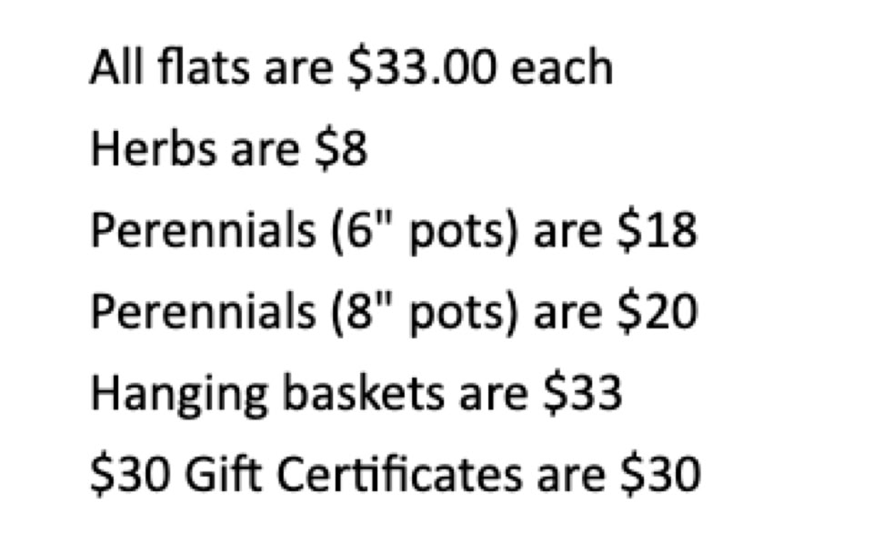 (for example 2 pink geranium hanging baskets @ $33 = $66 total)