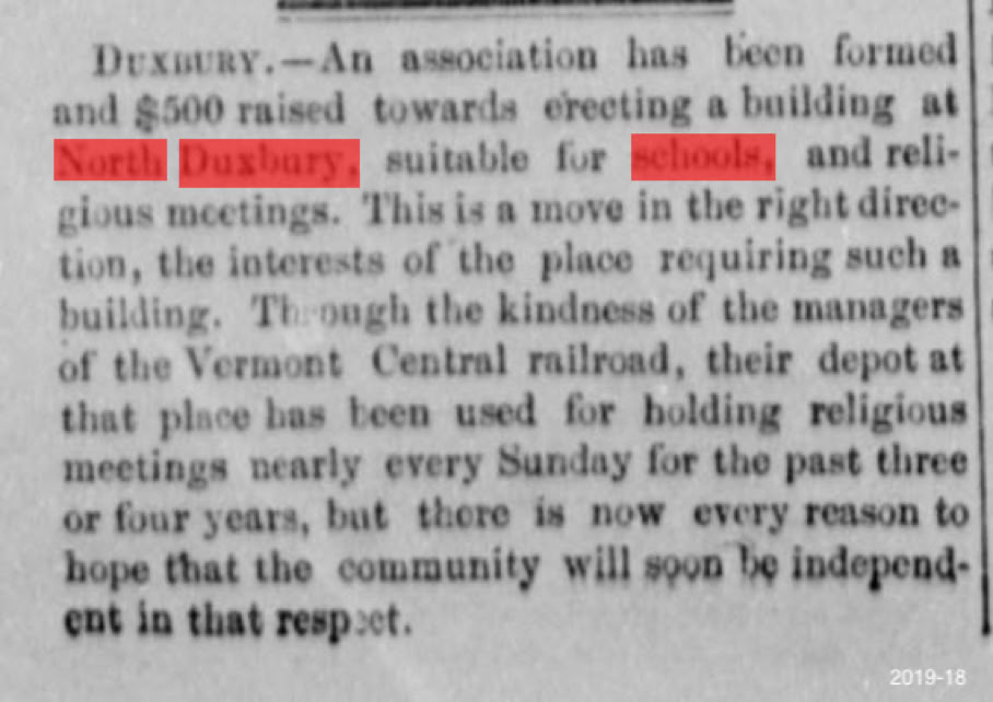 The North Duxbury Schoolhouse as it looks today. It was built in 1872 to double in use as a schoolhouse during the week and a church on Sunday. Prior to this residents held Sunday services in the Ridley Station Depot courtesy of the Central Vermont Railroad. See newspaper article from 8/21/1872. (2019-17;2019-18)